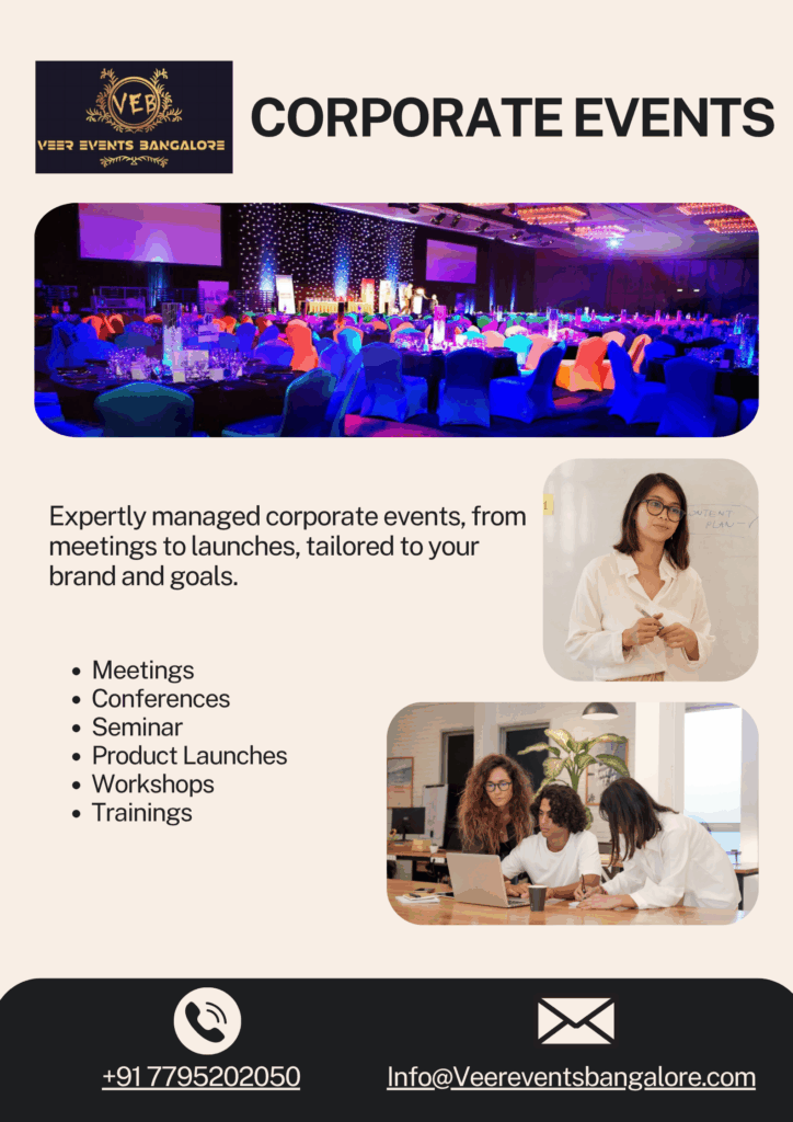 At Veer Events Bangalore, we craft exceptional corporate experiences that align with your business objectives and brand identity. Whether it’s strategic meetings, large-scale conferences, insightful seminars, or high-impact product launches, our expert team ensures flawless execution from start to finish. We also specialize in organizing interactive workshops, professional training sessions, and various business events that promote engagement, knowledge sharing, and collaboration. With a strong focus on detail, creativity, and professionalism, Veer Events transforms your corporate vision into a memorable reality.