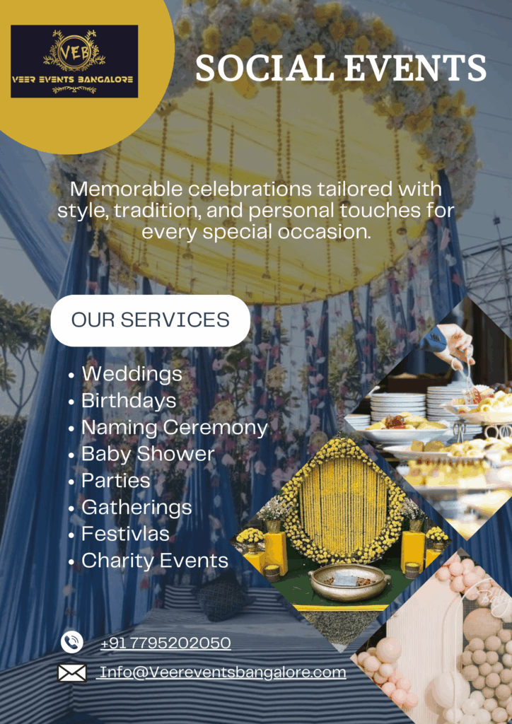 At Veer Events Bangalore, we bring your celebrations to life with creativity, elegance, and flawless execution. Whether it’s a grand wedding, a joyful birthday, a heartfelt naming ceremony, or a memorable baby shower, we ensure every detail reflects your vision. We also specialize in planning lively parties, intimate gatherings, vibrant festivals, and meaningful charity events, creating unforgettable experiences for you and your guests. With personalized themes, stunning decor, and professional coordination, Veer Events makes every occasion truly special and stress-free.